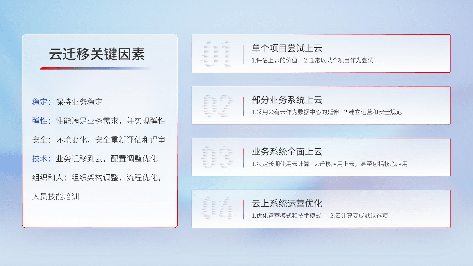 结合实际业务,,,,从规划设计、、、云平台选型、、、、云原生改造、、数据迁移、、、集成交付,,,迁移全过程为客户识别最佳上云路径,,,,做好风险识别管理,,,,设计网络架构、、、、身份权限、、、、安全审计合规、、操作审计、、、日志审计、、监控告警策略、、、多站点容灾设计等,,,对云上基础设施进行整体规划,,,,提升IT治理水平,,,,以满足弹性、、高可用、、高性能的需求。。。